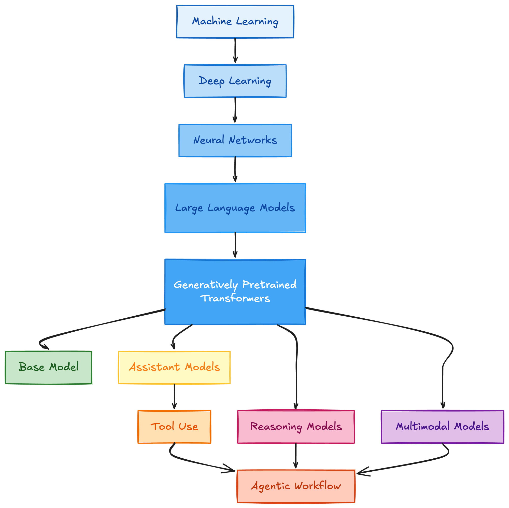 Deep learning creates narrow expert models for specific tasks. Large language models (LLMs) predict the next token using massive internet text, creating base